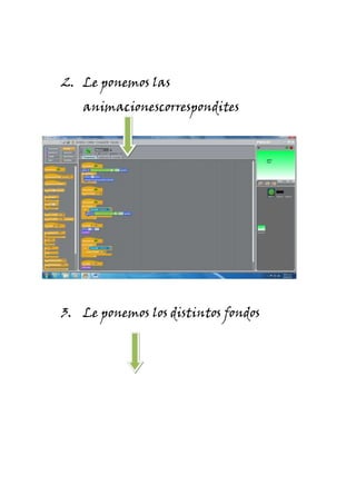 El documento describe los pasos para crear un juego en Scratch: 1) crear un objeto, 2) agregarle animaciones, 3) agregar fondos diferentes, y 4) completar el juego.