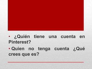 Pinterest es una red social basada en imágenes donde los usuarios pueden crear tableros temáticos ("pinboards") para guardar y compartir imágenes. Fue fundada en 2009 y ha crecido rápidamente, actualmente tiene 70 millones de usuarios. Los usuarios pueden buscar, guardar y compartir imágenes de productos, ideas y estilos de vida. Pinterest es popular entre las mujeres y las empresas lo usan para promocionar sus productos.