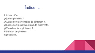 Pinterest es una plataforma para compartir imágenes que permite a los usuarios organizar colecciones de imágenes en tableros temáticos. Ofrece ventajas como mejorar el SEO al compartir enlaces a sitios web y conocer mejor al público objetivo. Las desventajas incluyen que consume mucho tiempo y puede haber problemas técnicos. Los usuarios organizan imágenes en tableros y Pinterest fue fundado en 2012 por Ben Silbermann con un enfoque en imágenes en lugar de texto.