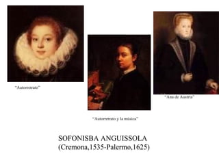 Este documento presenta una lista de artistas mujeres de diferentes épocas y países junto con ejemplos breves de sus obras, que incluyen autorretratos, retratos, bodegones y otras pinturas. Algunas de las artistas destacadas son Sofonisba Anguissola, Artemisia Gentileschi, Elisabeth Vigée-Le Brun, Tamara de Lempicka, Maruja Mallo y Menchu Lamas. La lista muestra la diversidad de estilos y temas abordados por mujeres artistas a través de los siglos.