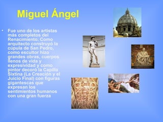 El documento describe a varios de los grandes artistas del Renacimiento como Miguel Ángel, Leonardo da Vinci y El Greco. Miguel Ángel fue uno de los artistas más completos, destacando como arquitecto, escultor y pintor. Entre sus obras más famosas se encuentran la decoración de la Capilla Sixtina y esculturas como La Piedad y David. Leonardo da Vinci fue un humanista polifacético que creó cuadros como La Gioconda y La Última Cena. El Greco se estableció en Toledo donde pintó ob