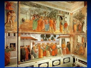 El documento proporciona información sobre pintores y obras importantes del período conocido como Quattrocento en Italia entre los siglos XV y XVI. Menciona a artistas como Fra Angelico, Masaccio, Botticelli, Perugino, Piero della Francesca y Andrea Mantegna, y describe algunas de sus obras más representativas como La Anunciación de Fra Angelico, los frescos de la Capilla Brancacci de Masaccio, La Primavera y El nacimiento de Venus de Botticelli, y pinturas de Perugino, Piero della Francesca y Mante