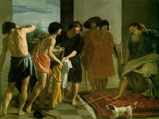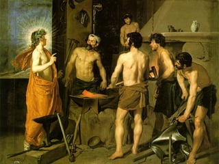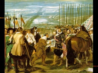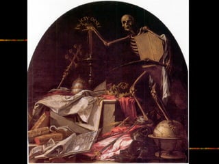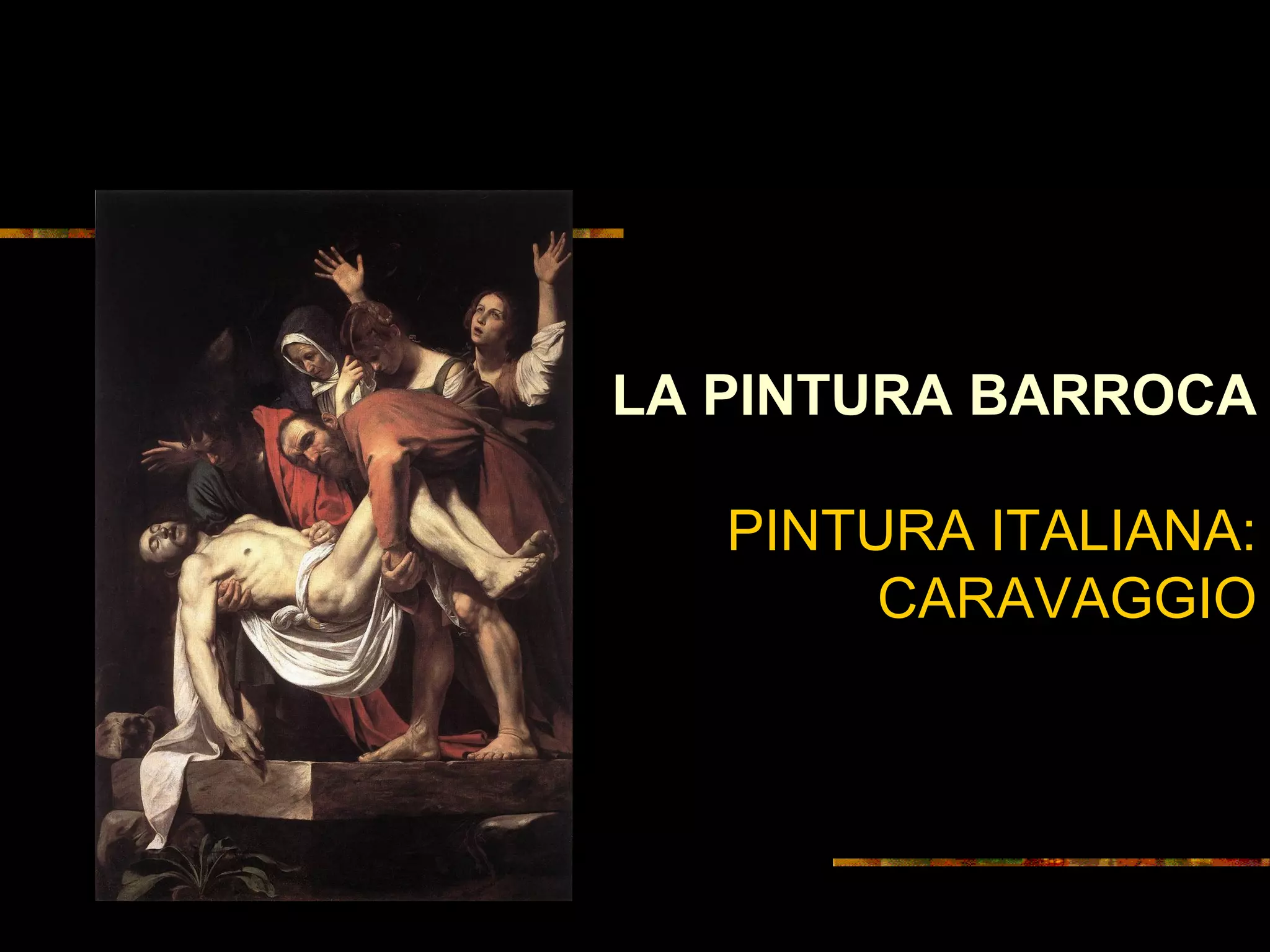 El documento describe las características principales de la pintura barroca, incluyendo su énfasis en el realismo, la composición asimétrica y el uso de la luz y el claroscuro. También resume las obras y estilos de importantes pintores barrocos italianos como Caravaggio, conocido por su tenebrismo, y de pintores españoles como Ribera, Zurbarán y Murillo. Finalmente, explica los temas religiosos y seculares más comunes en la pintura barroca.