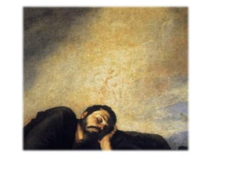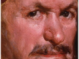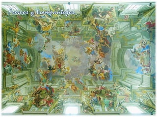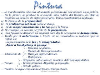 El documento describe las características principales de la pintura barroca. En particular, se enfatiza el uso de la luz y el movimiento para crear dramatismo, así como el realismo en la representación de temas religiosos y seculares. Además, se mencionan los estilos y técnicas distintivos de pintores barrocos importantes como Caravaggio, Rubens y Rembrandt.