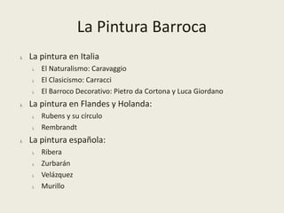 Este documento resume las características de la pintura barroca en Europa. Describe los principales estilos y artistas en Italia, incluyendo el naturalismo de Caravaggio, el clasicismo de los Carracci, y el barroco decorativo. También cubre la pintura en Flandes, Holanda, España, y las características generales del barroco como el uso del claroscuro y la expresividad dramática.