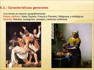 El documento describe las características generales de la pintura barroca en Europa, con un enfoque en Italia, Holanda y Flandes, y España. La pintura barroca se caracteriza por el uso del claroscuro, composiciones dinámicas, y el naturalismo. Artistas notables incluyen a Caravaggio, Rubens, Rembrandt, y Velázquez. Los temas variaron según la región, con énfasis en lo religioso en el sur y lo secular en el norte.
