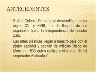 El documento describe la evolución de la pintura colonial en Perú entre los siglos XVI y XVIII. Se destaca la influencia de los pintores españoles, italianos y flamencos que trajeron nuevas técnicas a Perú. Los pintores indígenas y mestizos locales desarrollaron un estilo propio con temas religiosos y elementos de la flora y fauna peruana. La pintura alcanzó su punto máximo en el siglo XVIII con artistas como Diego Quispe Tito en Cusco y Cristóbal Lozano en Lima.