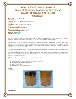 Este documento trata sobre el tema del plomo. En tres oraciones resume que el plomo es un metal pesado gris que se funde fácilmente y se usa en aleaciones con otros metales para aplicaciones industriales. También explica que los compuestos de plomo son tóxicos y su exposición excesiva o inadecuada puede causar envenenamiento en trabajadores. Por último, señala que el plomo puede causar efectos adversos como anemia, aumento de presión sanguínea, daño renal y perturbaciones en el sistema nervioso