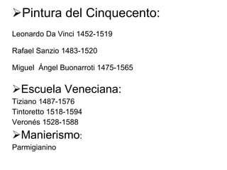El documento resume los principales artistas y obras del Renacimiento italiano entre los siglos XV y XVI, incluyendo a Leonardo da Vinci, Rafael, Miguel Ángel, Tiziano, Tintoretto, el Veronés y Parmigianino. Se destacan obras maestras como La última cena, La escuela de Atenas, El juicio final y retratos de la realeza europea. También se mencionan los temas mitológicos y religiosos abordados por los pintores venecianos.