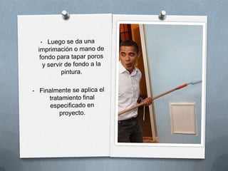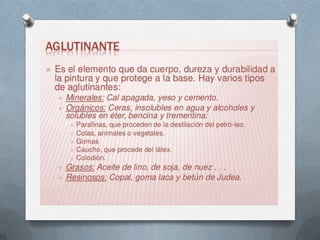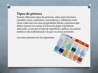 Este documento describe los diferentes tipos de pintura, incluyendo temple, pintura plástica, esmalte graso, esmalte sintético, pintura al cemento, pintura a la cal, lacado, pinturas decorativas, vinilo y pintura epoxica. También proporciona consejos sobre cómo pintar correctamente y elementos a controlar antes y después de la aplicación de pintura.