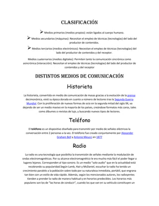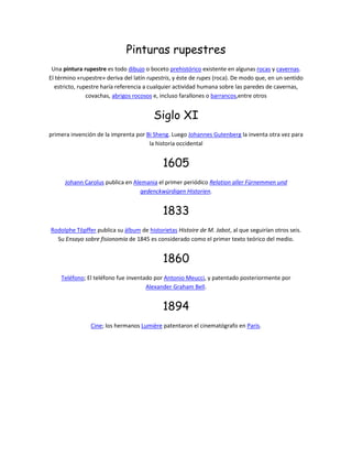 Una pintura rupestre es un dibujo prehistórico en rocas y cavernas. El término "rupestre" deriva del latín y se refiere a cualquier actividad humana en paredes rocosas, cavernas u otros lugares al aire libre. El documento también menciona algunas fechas clave en la historia de la imprenta, periódicos, historieta y la invención del teléfono y el cine.