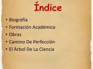 Pío Baroja fue un escritor español nacido en 1872 en San Sebastián. Estudió medicina aunque se decantó por la literatura. Escribió numerosas novelas que reflejaban la sociedad española de finales del siglo XIX y principios del XX, con personajes ansiosos y derrotados por la vida. Algunas de sus obras más destacadas fueron Camino de perfección, El árbol de la ciencia y la trilogía La lucha por la vida. Emigró a Francia durante la guerra civil española y reg