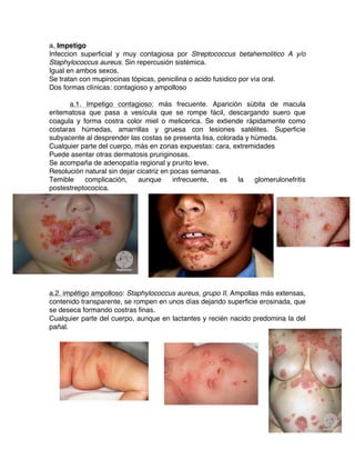 Este documento describe varias infecciones bacterianas de la piel como impétigo, foliculitis, forúnculos, antrax, erisipela, celulitis aguda, ectima, perionixis bacteriana, eritrasma, erisipeloide, hidrosadenitis, queratólitis punteada, síndrome de shock tóxico, infecciones por Pseudomonas y tuberculosis cutánea. Causantes comunes incluyen Staphylococcus aureus, Streptococcus spp. y otras bacterias. Los síntomas, tratamientos y características de cada