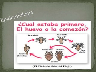 Este documento describe las generalidades sobre los piojos, incluyendo sus características, ciclo de vida, especies que afectan humanos, animales de compañía y ganado. Explica que los piojos son pequeños insectos que viven chupando la sangre de su hospedador, pasan por una metamorfosis incompleta, y se transmiten por contacto directo o a través de la ropa u objetos. También cubre los métodos para controlar las infestaciones de piojos.