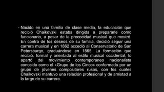 Piotr Ilich Chaikovski nació en una familia de clase media en Rusia y mostró una precocidad musical desde pequeño. A pesar de los deseos de su familia de que siguiera una carrera como funcionario, decidió estudiar música en el Conservatorio de San Petersburgo. Desarrolló su estilo componiendo en diversos géneros como sinfonías, óperas y ballets. Aunque tuvo éxitos, sufrió crisis personales y depresión debido a su homosexualidad reprimida y otros factores.