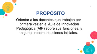 El documento proporciona orientación a los docentes que trabajarán por primera vez en un Aula de Innovación Pedagógica. Explica las funciones del Profesor de Innovación Pedagógica, como elaborar documentos para el funcionamiento del aula, capacitar a otros docentes, mantener los recursos tecnológicos y asegurar su uso ético. También resume normativas relacionadas a la incorporación de tecnologías digitales en la educación y los componentes requeridos en la estrategia y plan de implementación tecnológica de una instit