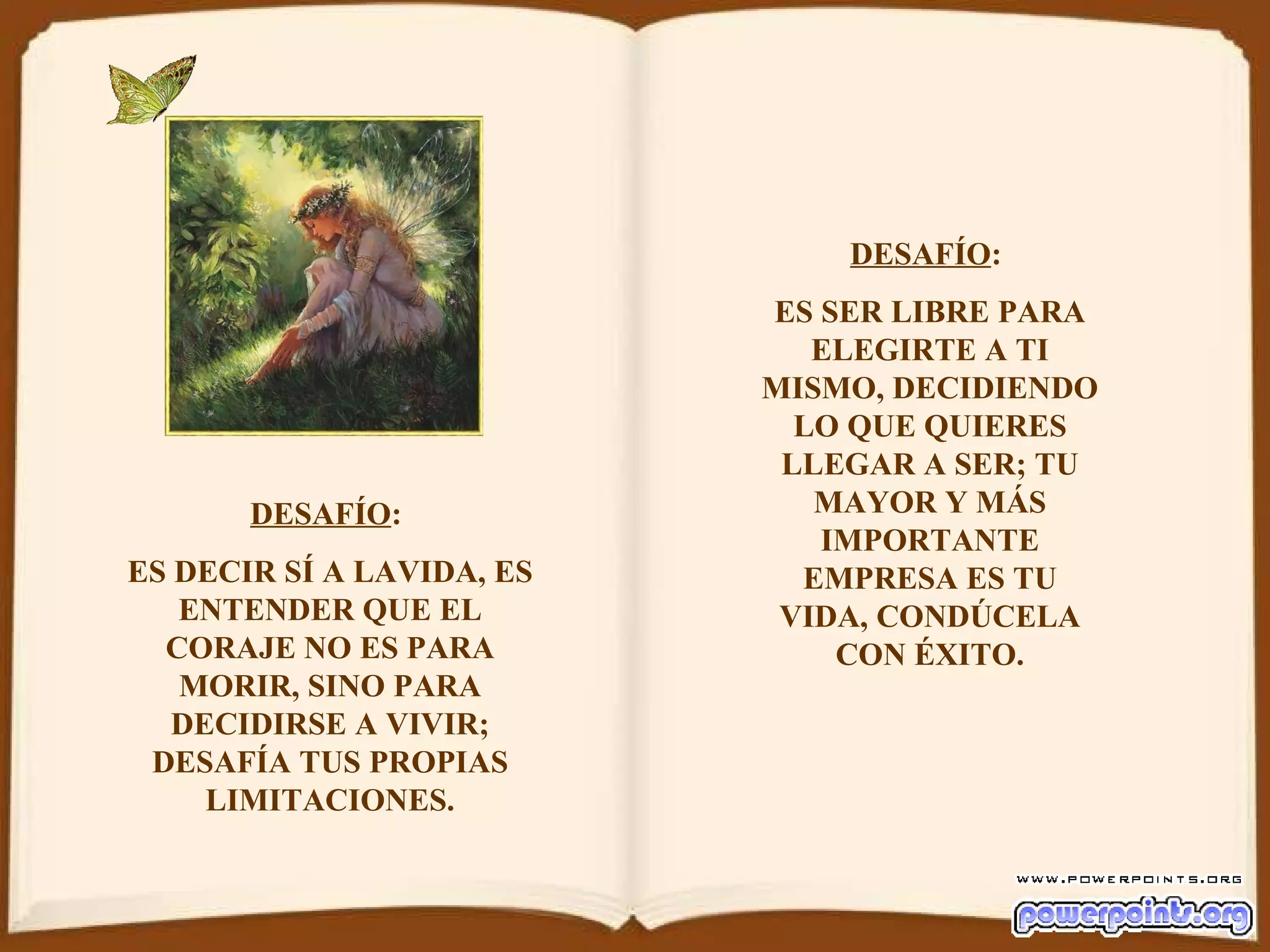 El documento presenta una serie de desafíos para vivir la vida de forma plena y alcanzar el éxito. Algunos de los desafíos mencionados son aceptar la vida y superar los propios límites, ser dueño de la propia vida y destino aunque no se elija el contexto de nacimiento, convertir las derrotas en victorias y reinventarse continuamente para alcanzar las metas deseadas. Otro desafío es aprovechar todas las oportunidades y esforzarse para lograr objetivos en la vida a través del compromiso y el