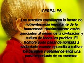 El documento describe la pirámide alimenticia, incluyendo los principales grupos de alimentos como cereales, verduras y hortalizas, frutas, leche y sus derivados, carne, pollo y huevos. Explica que los cereales son la principal fuente de nutrientes para la humanidad y cómo diferentes culturas consumen diferentes tipos de cereales. También describe los beneficios nutricionales de las verduras, frutas y leche, así como la importancia de las proteínas de la carne y los huevos para los niños pequeños. Finalmente, recom