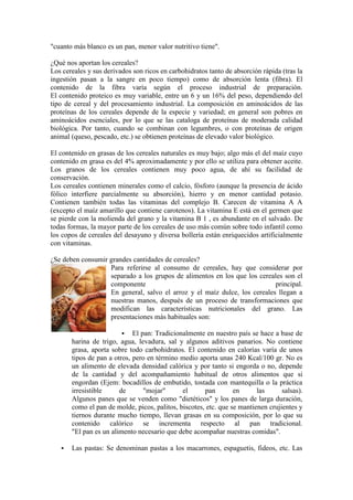 El documento habla sobre los cereales. Explica que los cereales son una fuente importante de nutrientes para la humanidad y que su consumo permitió que el hombre pasara de ser nómada a sedentario. Luego describe los cereales más consumidos en diferentes partes del mundo y sus características nutricionales. Finalmente, analiza el valor nutricional de los cereales y algunos productos derivados de ellos.