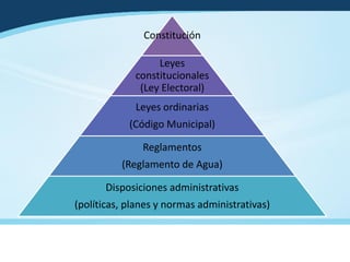 La jerarquía de las leyes se organiza como una pirámide, con la Constitución en la cima, seguida por las leyes constitucionales y ordinarias, luego los reglamentos, y finalmente las disposiciones administrativas en la base.