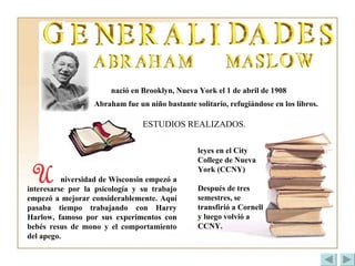 El documento describe la vida y teoría de la motivación de Abraham Maslow. Maslow nació en 1908 y desarrolló una teoría jerárquica de las necesidades humanas que van desde las fisiológicas básicas hasta la auto-actualización. Propuso que las personas buscan satisfacer primero sus necesidades fisiológicas, de seguridad, sociales, de estima y de autorrealización.