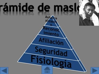 El documento presenta una diapositiva sobre la biografía y trabajo de Abraham Maslow, conocido como fundador de la psicología humanista. Luego describe su teoría de la jerarquía de necesidades humanas dividida en 5 niveles: 1) Necesidades fisiológicas, 2) Seguridad, 3) Afiliación social, 4) Estimación y 5) Autorrealización. Cada nivel describe las necesidades básicas que busca satisfacer el individuo.