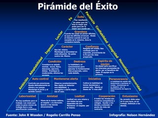 El documento describe la Pirámide del Éxito de John Wooden, un entrenador de baloncesto estadounidense. La pirámide presenta los principios fundamentales para lograr el éxito, comenzando por la laboriosidad y el entusiasmo en la base, y progresando a través de la amistad, la lealtad y otros conceptos hasta alcanzar la cima del éxito y la grandeza.