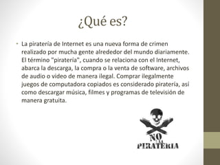 La piratería en Internet incluye la descarga, compra o venta ilegal de software, música y videos. Programas como Napster, Kazaa y Limewire permiten descargar archivos de forma gratuita pero ilegal a través de redes peer-to-peer. Mientras que algunas empresas protegen fuertemente sus productos contra la copia, otras parecen no importarles que sus productos sean copiados, ya que la piratería puede ayudar a promoverlos a través de amigos. La piratería de software causa pérdidas estimadas de 40 mil millones de dóla