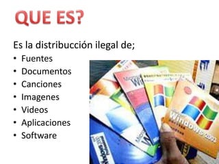La piratería informática se refiere a la distribución ilegal de fuentes, documentos, canciones, imágenes, videos, aplicaciones y software. Las personas que realizan estas acciones se les conoce como "hackers" o piratas informáticos, y al distribuir este contenido de forma ilegal están cometiendo ciberdelitos que causan grandes pérdidas monetarias a los propietarios legítimos de la propiedad intelectual.