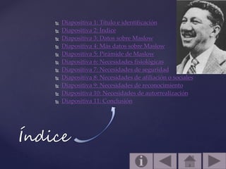 El documento presenta la teoría de la jerarquía de necesidades de Abraham Maslow. Explica que Maslow propuso que los seres humanos tienen necesidades fisiológicas, de seguridad, sociales, de reconocimiento y de autorrealización. Estas necesidades se organizan en forma de pirámide, de modo que las necesidades más básicas deben satisfacerse primero antes de poder alcanzar las necesidades más elevadas. El documento describe cada tipo de necesidad en detalle.
