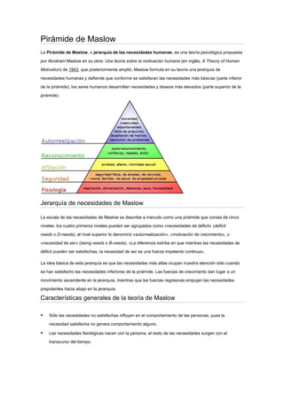 La teoría de la jerarquía de las necesidades humanas de Maslow propone que las personas tienen cinco niveles de necesidades: fisiológicas, de seguridad, sociales, de estima y de autorrealización. Sólo cuando se satisfacen las necesidades más básicas, las personas desarrollan necesidades más elevadas. La teoría sugiere que diferentes fuerzas motivan el comportamiento dependiendo de qué necesidades están satisfechas o no en cada momento.