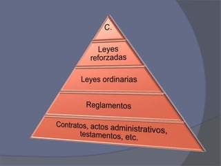 El documento analiza la transición de la pirámide de Kelsen a la pirámide invertida, describiendo diferentes conceptos jurídicos como ser jurídico, potencia jurídica y espacio jurídico. Presenta un modelo jerárquico del orden jurídico en varios niveles, desde la realidad extramental hasta la realización del derecho. La síntesis final es que el orden jurídico y sus principios están interrelacionados, apuntando a un fin último de justicia y orden social.