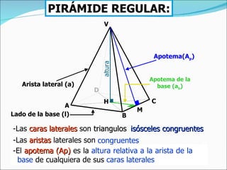 El documento define una pirámide como un poliedro con caras laterales triangulares que comparten un vértice común y una base poligonal. Describe una pirámide regular como aquella con caras laterales isósceles congruentes y aristas laterales congruentes. Explica cómo calcular el área lateral, área total y volumen de una pirámide regular, así como de un tronco de pirámide.