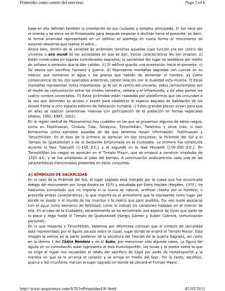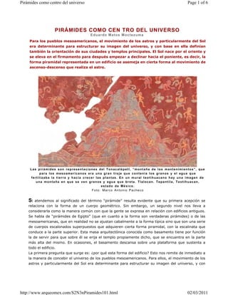 Las pirámides mesoamericanas, como la pirámide del sol y el templo mayor de Tenochtitlan, representan el centro del universo en la cosmovisión de estas culturas, integrando elementos de sacralidad, orientación hacia el poniente, sacrificio humano y dualidad vida-muerte. Estas estructuras eran vistas como montañas sagradas que conectaban el mundo terrenal con el celeste y el inframundo, además de ser el eje central de ceremonias masivas. En su diseño y ubicación, las pirámides reflejan la imagen del cosmos, sirviendo como vehículos para la comunicación entre diferentes niveles de existencia.