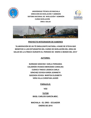 El documento trata sobre la elaboración de un té endulzante natural a base de stevia que beneficiará a los estudiantes del curso de nivelación del área de salud de la Universidad Técnica de Machala durante el período de enero a marzo de 2014. Se realizará una investigación sobre los antecedentes y beneficios de la stevia, se planificará el proyecto con roles y cronograma, se aplicarán encuestas y entrevistas para analizar resultados, y finalmente se propondrá la elaboración del té endulzante de stev