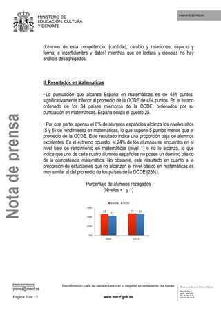 El documento presenta los resultados de España en la prueba PISA 2012, realizada a 25.313 estudiantes españoles de 15 años. España obtuvo una puntuación inferior al promedio de la OCDE en matemáticas, lectura y ciencias. En matemáticas, solo el 8% de estudiantes alcanzó los niveles altos, y el 24% se ubicó en el nivel bajo. Los resultados de España permanecieron básicamente estables respecto a ediciones anteriores de PISA, y siguen situándose por debajo del promedio de la OC