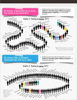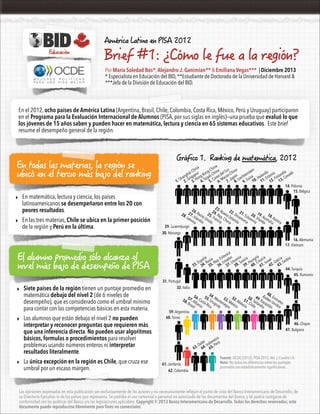 1) El documento resume el desempeño de los países latinoamericanos en la prueba PISA 2012 de matemática, lectura y ciencia, donde se ubicaron entre los de peores resultados. Chile tuvo el mejor desempeño regional y Perú el peor.