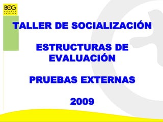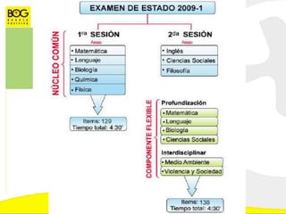 Este documento resume tres evaluaciones educativas clave: la prueba PISA 2009, la prueba SABER y el Examen de Estado para ingreso a la educación superior. Describe los objetivos, poblaciones evaluadas e instrumentos de cada una. También presenta detalles sobre los instrumentos y áreas evaluadas por la prueba PISA 2009, enfocándose en lectura, matemáticas y ciencias.