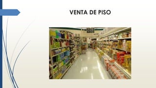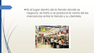 Este documento describe los diferentes tipos de muebles y estructuras utilizados en el piso de venta de una tienda para exhibir y vender mercancías a los clientes. Explica que existen góndolas "chimeneas" divididas en baldas para acomodar productos, cabeceras de góndola en los extremos de las góndolas que se utilizan para mercadeo cruzado, islas en el centro de los pasillos, y muebles refrigerados para productos frescos o congelados. Además, la mercancía