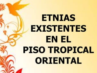 Este documento describe las diferentes etnias y comunidades indígenas que viven en el piso tropical oriental de Ecuador, incluyendo los Huaorani, Cofán, Tagaeri, Shuar, Siona Secoya, Shiwiar, Achuar, Andoas, Quichuas y Zápara. También describe los recursos naturales no renovables como el petróleo y las minas de oro, así como los atractivos turísticos como el Parque Nacional Yasuní, la Reserva de Producción Faunística Cuyabeno y el Parque Nacional Podocar