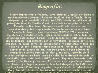 Camille Pissarro fue un pintor impresionista francés nacido en 1830 en las Islas Vírgenes. Se trasladó a París en 1855 donde estudió con el pintor paisajista Camille Corot. Inicialmente asociado con la Escuela de Barbizon, más tarde se unió a los impresionistas y exhibió en todas sus exposiciones. Pintó escenas rurales y callejeras en París, así como paisajes influenciado por el arte inglés. Fue un prolífico y exitoso maestro cuyos alumnos incluy
