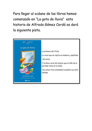 Este texto muy breve presenta una historia de Alfredo Gómez Cerdá que servirá como pista para llegar al "océano de los libros". Se menciona que la historia comienza con "La gota de lluvia" y que esta dará la siguiente pista para alcanzar el objetivo final.