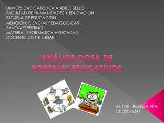 Este documento presenta un análisis DOFA de dos portales educativos utilizando criterios como apariencia, contenido y utilidad. El primer portal, Curiosikid, tiene una apariencia atractiva pero contenido básico solo en español. El segundo portal, e-Ducativa, tiene mucho contenido en dos idiomas pero una apariencia opaca. El resumen concluye que es importante conocer estos y otros portales educativos para complementar el trabajo docente y hacer la educación más dinámica e interactiva mediante el uso de la tecnología.