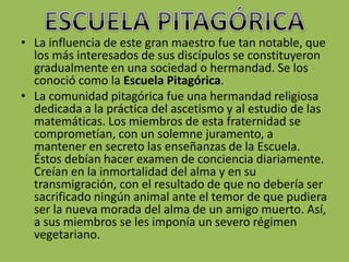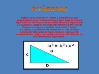 Pitágoras de Samos fue un importante filósofo y matemático griego del siglo VI a.C. que realizó contribuciones significativas al desarrollo de las matemáticas helénicas, la geometría y la aritmética. Es conocido principalmente por su teorema sobre los triángulos rectángulos. Fundó la escuela pitagórica, una hermandad dedicada al estudio de las matemáticas y la filosofía.