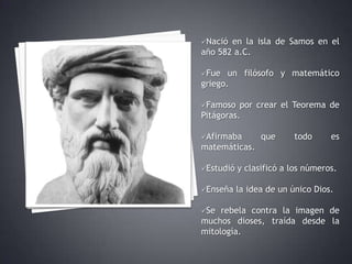Pitágoras fue un filósofo y matemático griego nacido en Samos en 582 a.C. que es famoso por crear el Teorema de Pitágoras y afirmar que todo es matemáticas. Fundó la hermandad pitagórica para enseñar sus ideas matemáticas, religiosas y filosóficas, incluyendo la existencia de un único Dios en lugar de muchos dioses. Realizó importantes descubrimientos matemáticos como ternas pitagóricas, sólidos regulares y números perfectos que se
