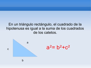 El documento explica el Teorema de Pitágoras, que establece que en un triángulo rectángulo, la suma de los cuadrados de los catetos es igual al cuadrado de la hipotenusa. También proporciona información sobre Pitágoras de Samos, el filósofo y matemático griego que descubrió este teorema, y ofrece diferentes demostraciones y ejercicios para comprenderlo mejor.