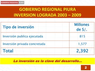 El documento detalla la gestión de inversiones en la región de Piura entre 2003 y 2009, donde se alcanzó una inversión total de 865.2 millones de nuevos soles. Para el año 2009, el presupuesto institucional asignó el 40% a proyectos de inversión, logrando una ejecución del 46% de dicho presupuesto. Además, se presentan proyecciones y gestiones para el año 2010, incluyendo la incorporación de recursos y proyectos de infraestructura educativa y vial.