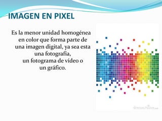 Un pixel es la unidad más pequeña que forma una imagen digital, como una foto o video. Las imágenes digitales se componen de pixeles, y al ampliar una imagen se pueden ver los pixeles individuales más claramente. Una imagen vectorial está formada por objetos geométricos independientes definidos por atributos matemáticos como la forma, posición y color.