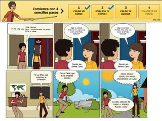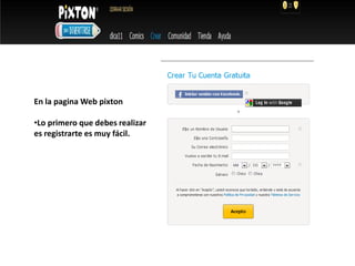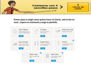 El documento proporciona instrucciones para crear un cómic en la página web Pixton en menos de 3 oraciones. Primero, los usuarios deben registrarse y crear una plantilla de cómic. Luego, seleccionan personajes y editan viñetas agregando diálogos y escenarios. Finalmente, guardan y publican el cómic terminado.