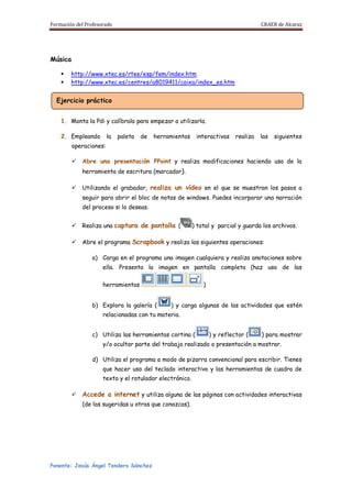 Este documento presenta una lista de recursos web relacionados con diferentes asignaturas escolares como matemáticas, física, ciencias naturales, ciencias sociales, idiomas y música. También incluye instrucciones para el uso de una pizarra digital interactiva, como abrir presentaciones y videos, tomar capturas de pantalla, y utilizar herramientas como marcadores y cuadros de texto. El objetivo es proporcionar recursos docentes y familiarizar a los profesores con las funciones básicas de una pizarra digital.